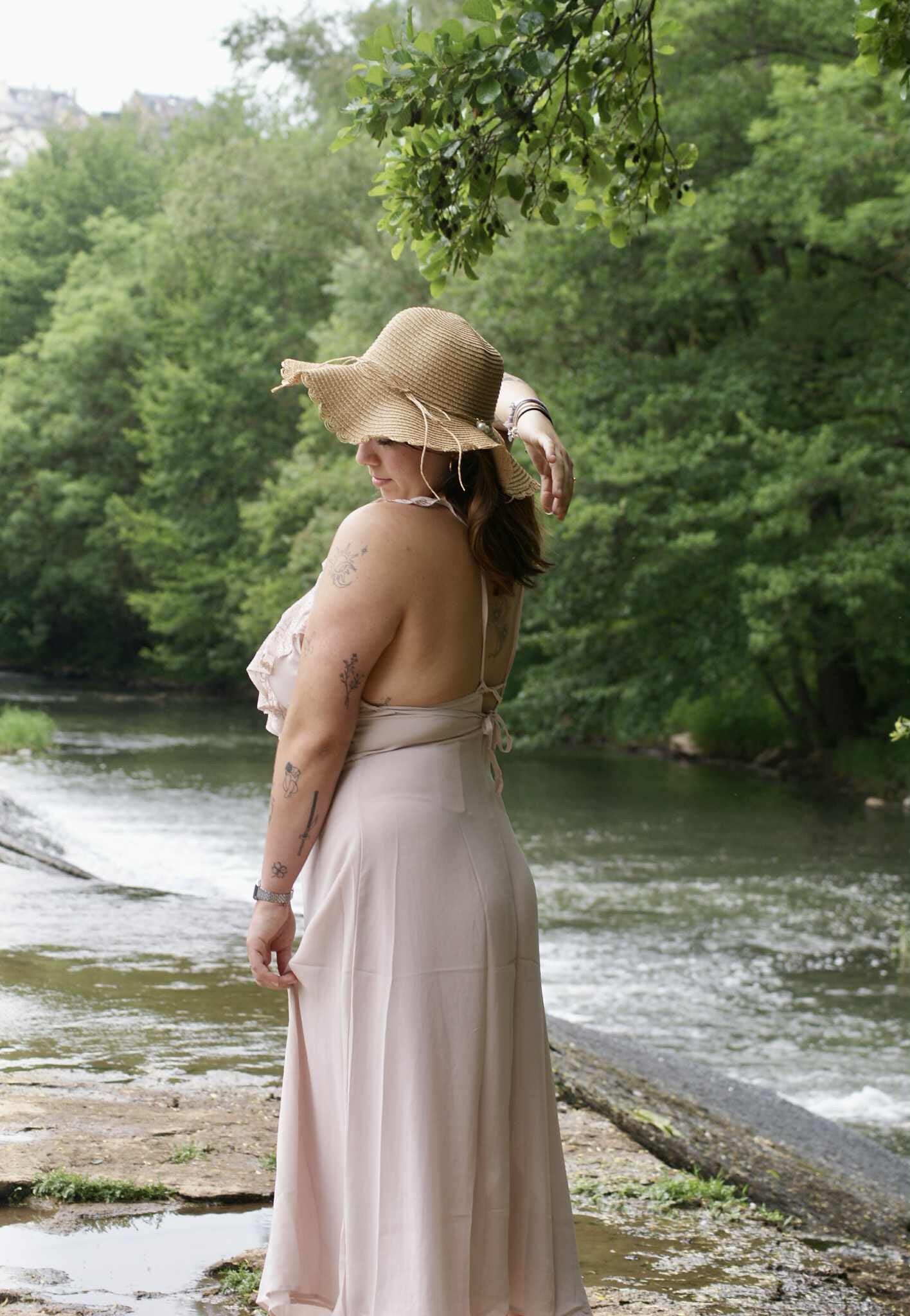 Robe de couleur pierre élégante,fluide,sans manche,décolletée.Avec une petite pointe de paillette.